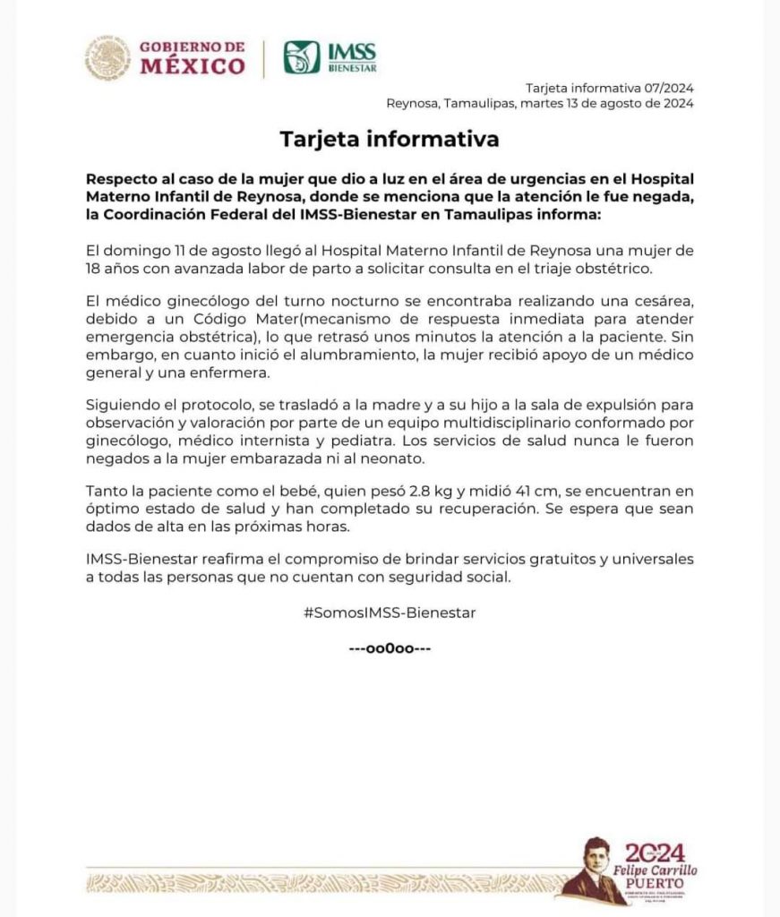 La Coordinación Federal del IMSS-Bienestar en Tamaulipas indicó que la mujer de 18 años llegó al Hospital Materno Infantil de Reynosa con avanzada labor de parto a solicitar consulta en el triaje obstétrico, sin embargo el médico ginecólogo del turno nocturno se encontraba realizando una cesárea.